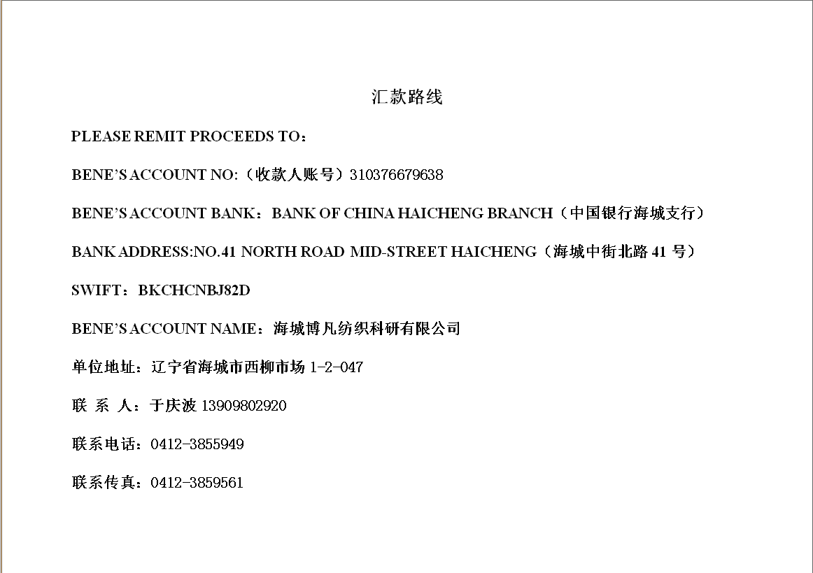 Company Haicheng Bofan Textile Technology Co., Ltd. Cellphone 139-0980-2920 TEL  0412-385-5949